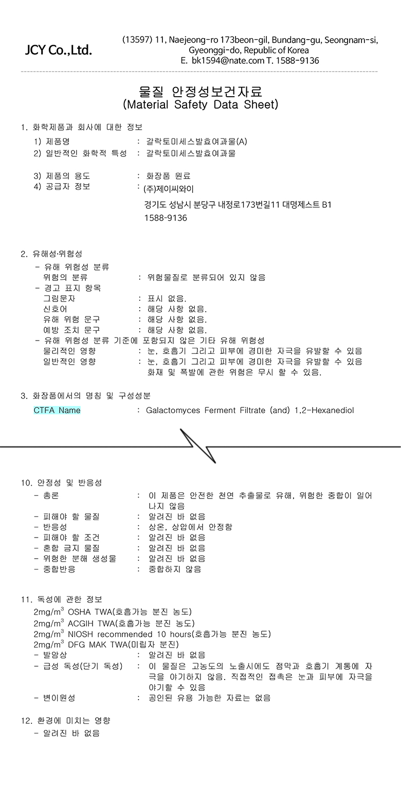| 주의사항 | 갈락토미세스 발효여과물이 천연추출물이나 천연방부제(갈락토미세스도 천연추출물의 일종)를 만나면 작은 응고물이 생기는 경우가 있습니다. 곰팡이나 다른 이물질이 아니라서 완성된 화장품에는 별 문제가 없습니다. 혹시라도 작은 응고물이 신경이 쓰인다면 걸러내고 사용해주세요. 또한 갈락토미세스 발효여과물은 피부내의 독*배출에 좋은 효능을 가지고 있습니다. 그래서 사용초기에 독*가 피부밖으로 배출되는 과정에서 작은 뾰루지가 생길 수 있습니다. |