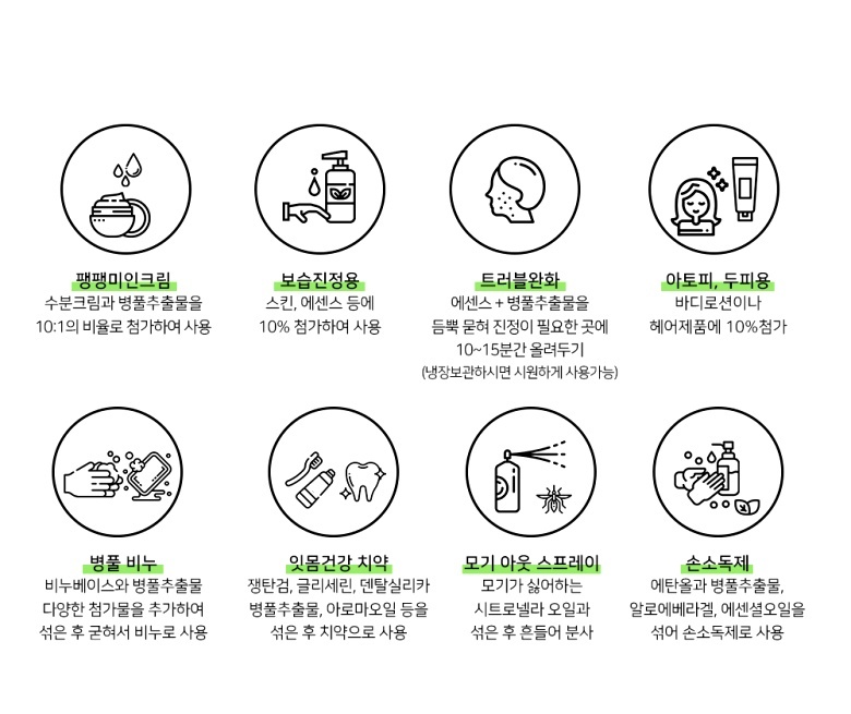 화장품, MP 및 CP 등의 비누 만들기에 사용 샴푸, 세정제 : 5% 내외 로션, 크림 : 1~4% 스킨, 미스트 : 1~3% 천연비누: 5% 내외 |