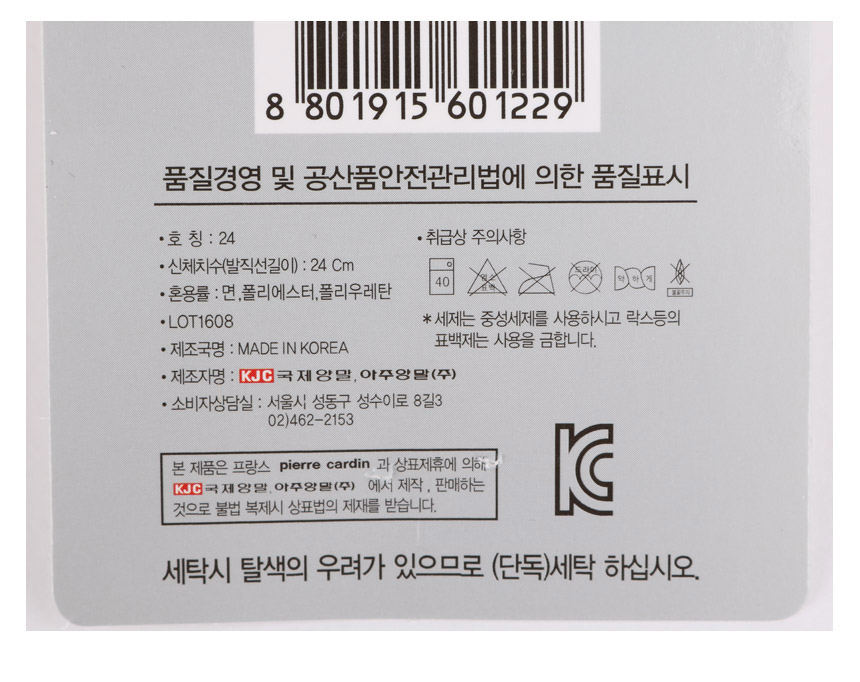 국내산 정품 인증 마크와 제품 정보 , 세탁시 주의사항