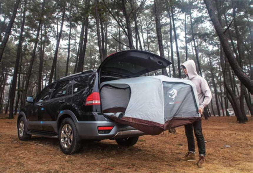 4면 개방 구조로 한여름에도 시원하게 쓸 수 있도록 통풍성을 높일 뿐만 아니라, 트렁크와 양 옆의 문을 통해서도 출입이 가능합니다. 또한 운전석 룸미러를 통해 후방 확인이 가능하기 때문에 텐트를 설치한 채로 운전이 가능합니다.