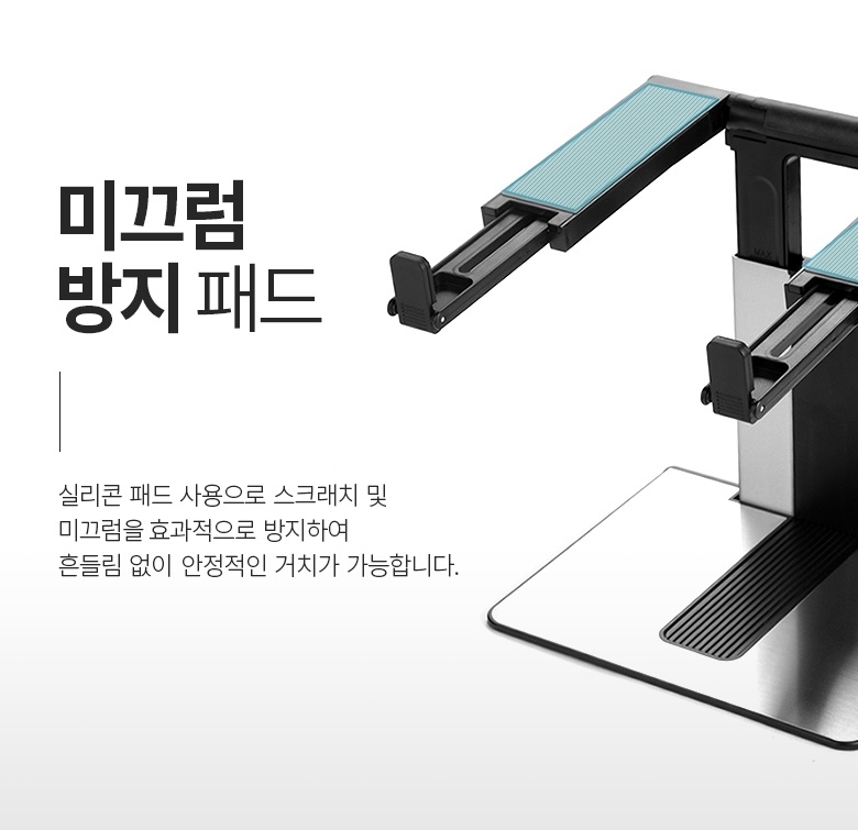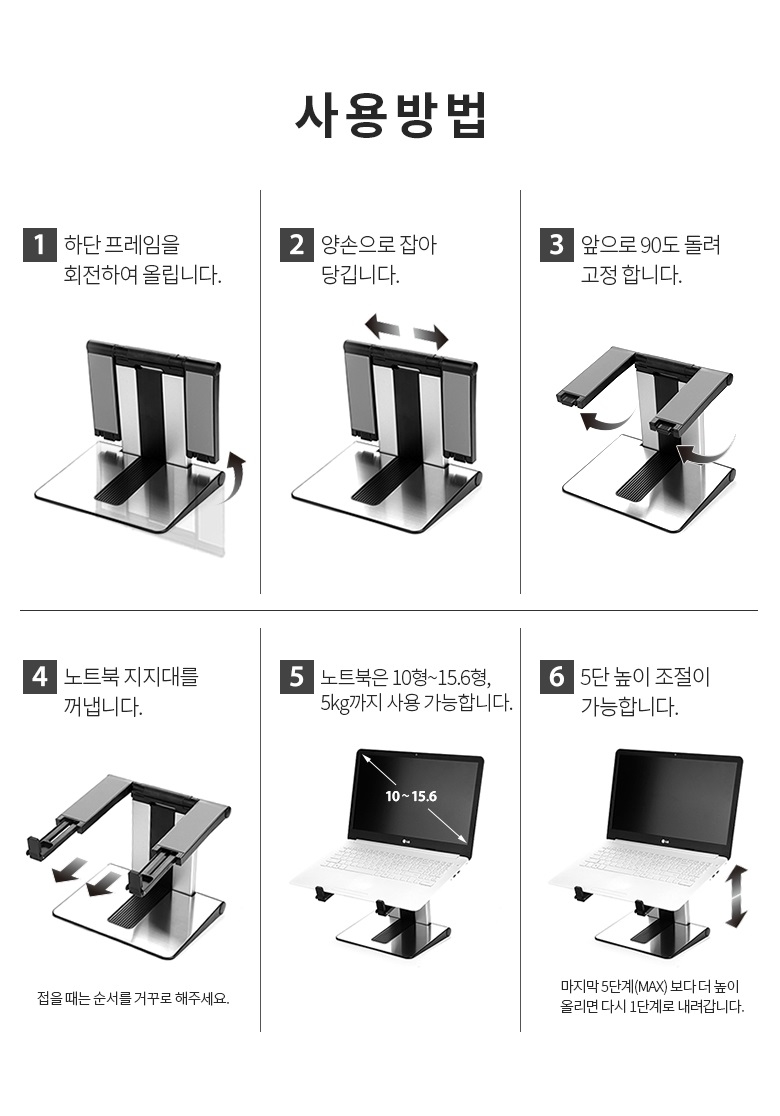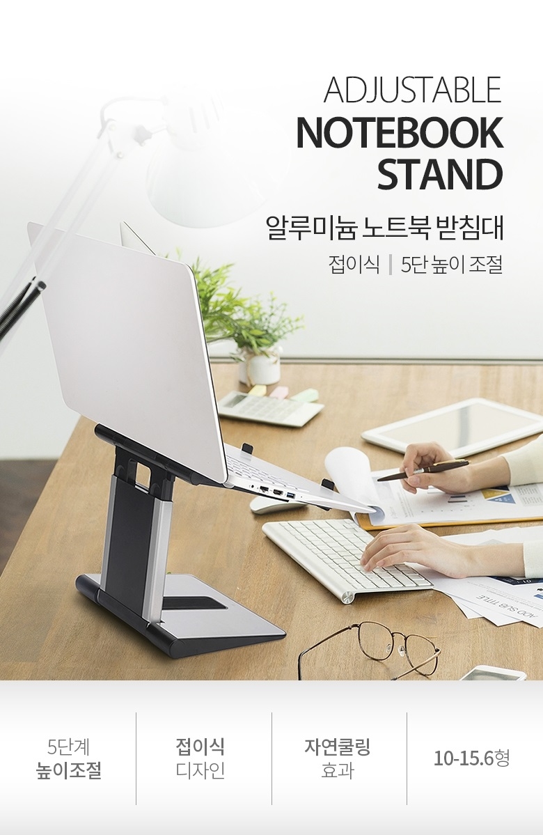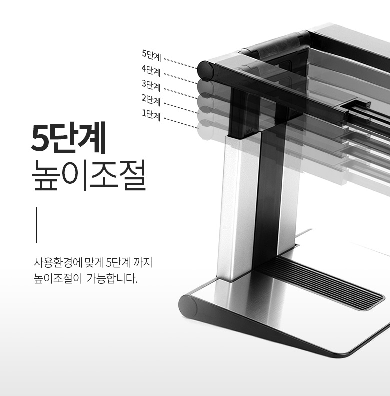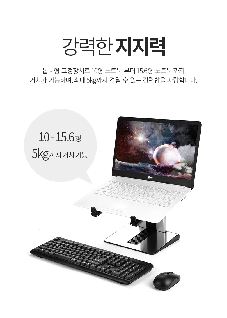 톱니형 고정장치로 10형 노트북 부터 15.6형 노트북까지 거치가 가능하며, 최대 5kg까지 견딜 수 있는 강력함을 자랑합니다.