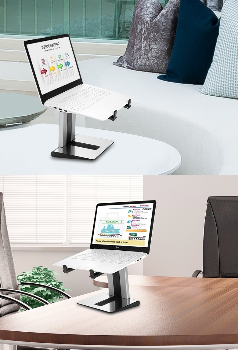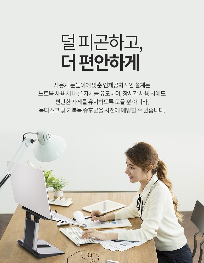 사용자 눈높이에 맞춘 인체공학적인 설계는 노트북 사용시 바른자세를 유도하며, 장시간 사용시에도 편안한 자세를 유지하도록 도울 뿐 아니라, 목디스크 및 거북목 증후군을 사전에 예방 할 수 있습니다.