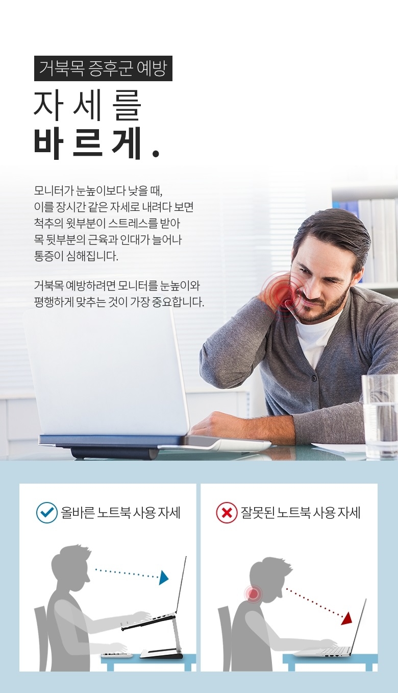 모니터가 눈높이보다 낮을때, 이를 장시간 같은 자세로 내려다 보면 척추의 윗부분이 스트레스를 받아 목 뒷부분의 근육과 인대가 늘어나 통증이 심해 집니다.거북목 증후군을 예방하려면 모니터를 눈높이와 평행하게 맞추는 것이 가장 중요합니다.