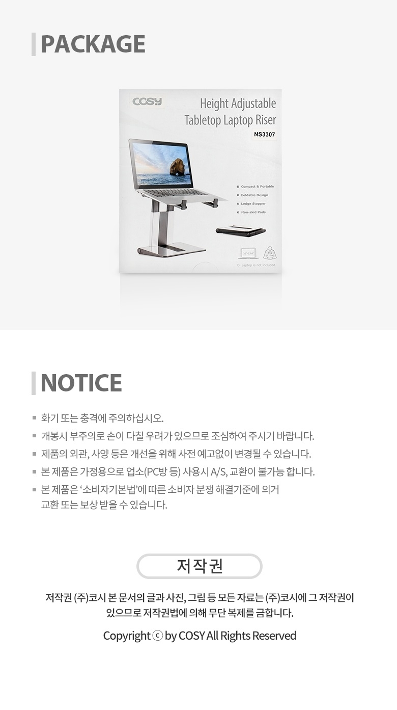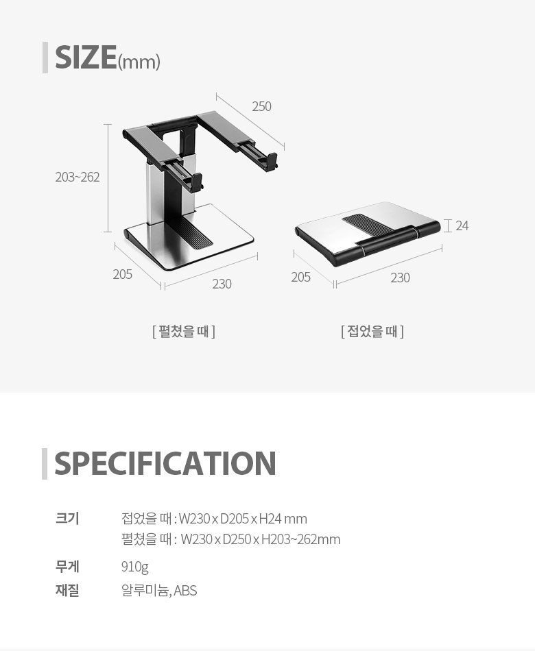 | 사이즈 | 접었을때 W230 x D205 x H24mm 펼쳤을때 W230 x D250 x H203~262mm |