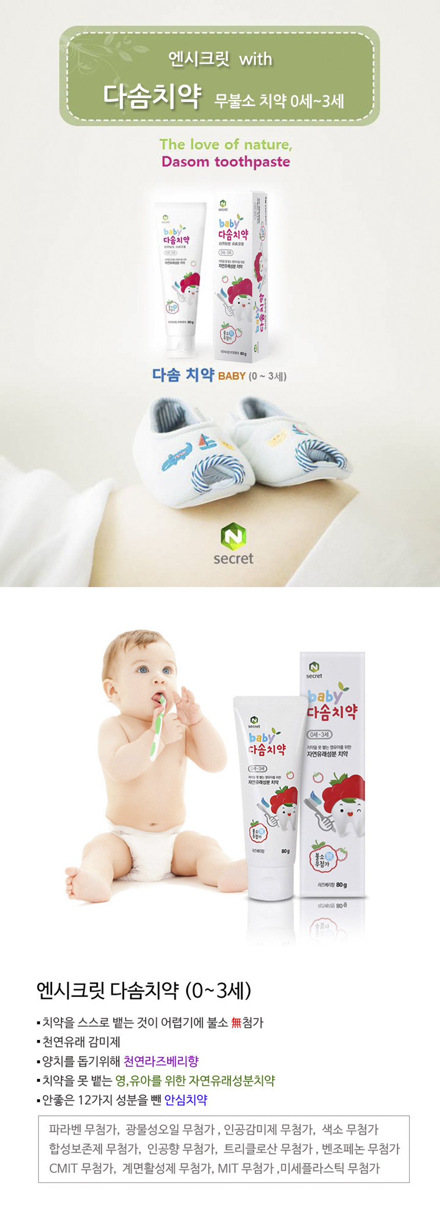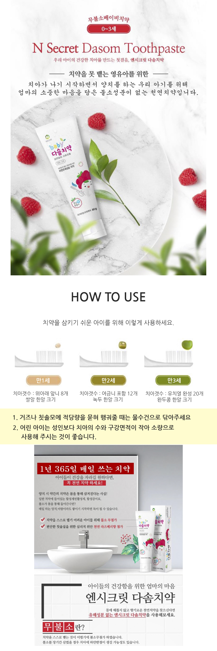 | 다솜치약 | 불소 무첨가, 안 좋은 12가지 성분을 뺀 안심치약. 아이의 양치를 돕기 위한 천연 라즈베리향. 0세 ~ 3세 베이비 전용 |