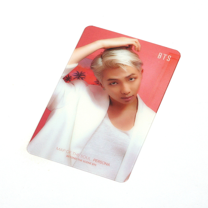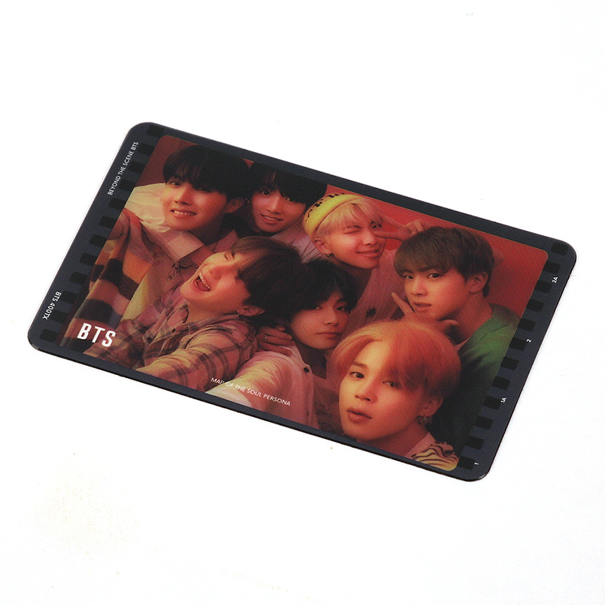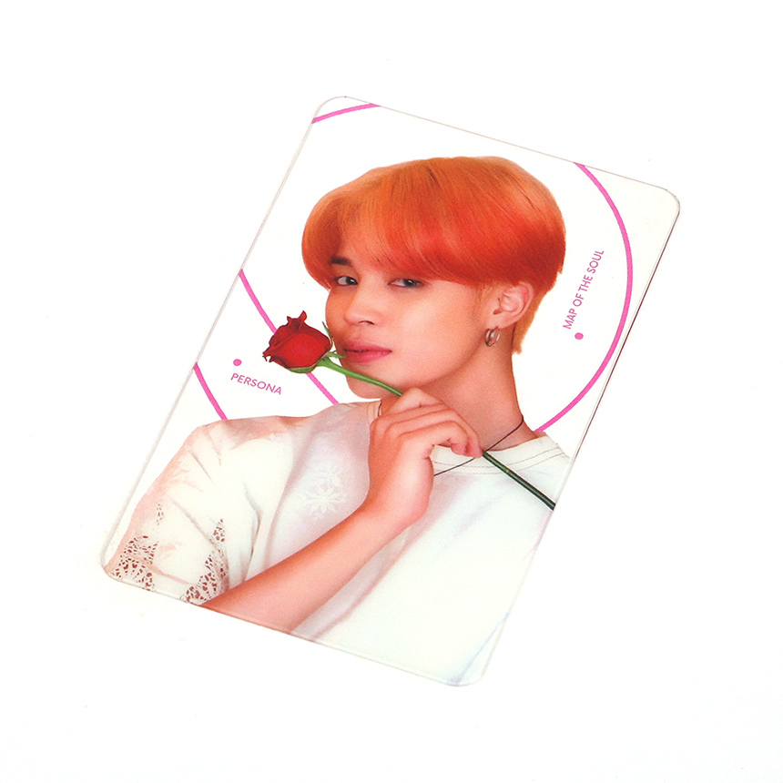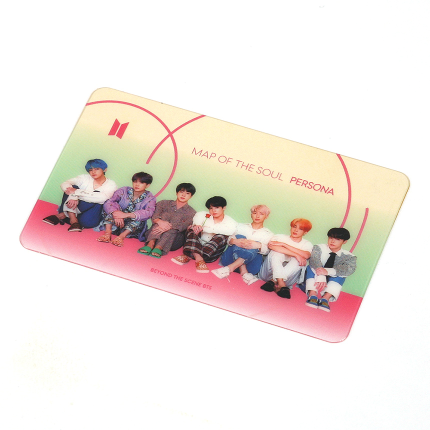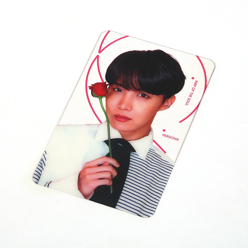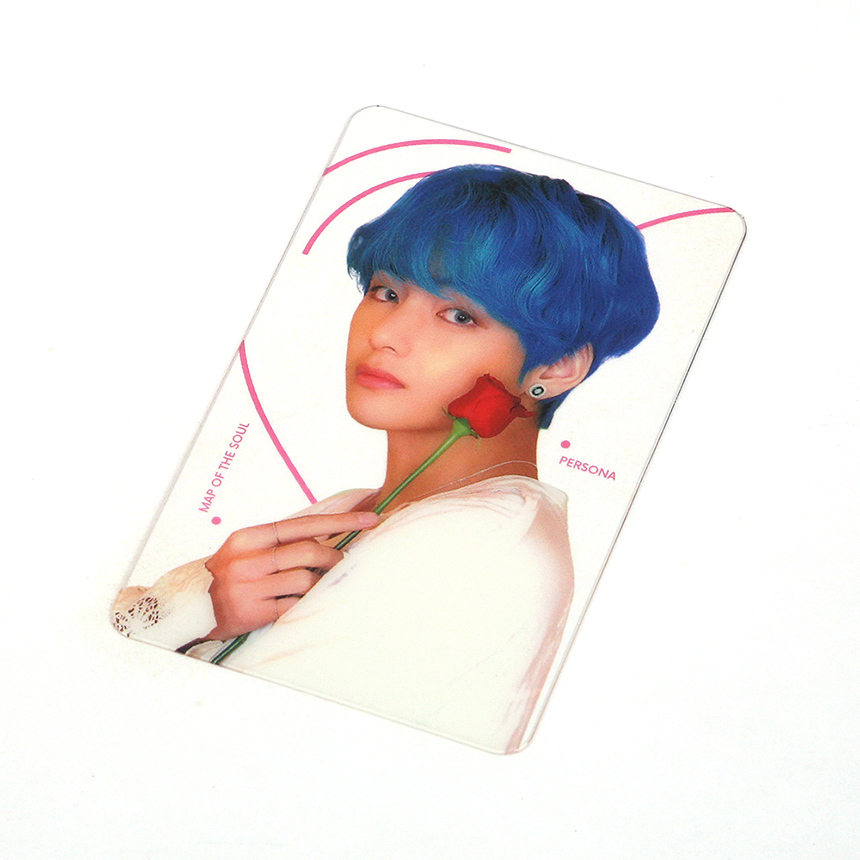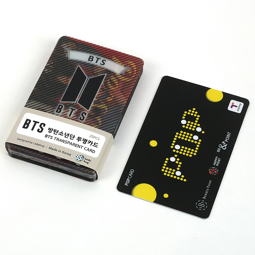 투명한 플라스틱 카드에 방탄소년단 BTS의 사진이 인쇄된 독특한 느낌의 투명 포토카드입니다.