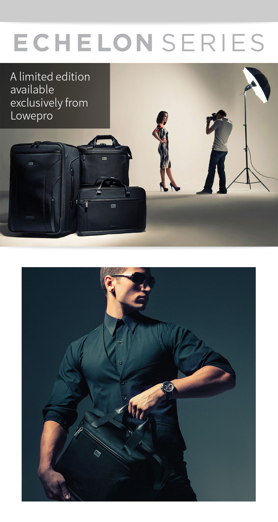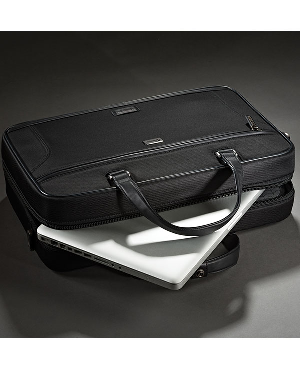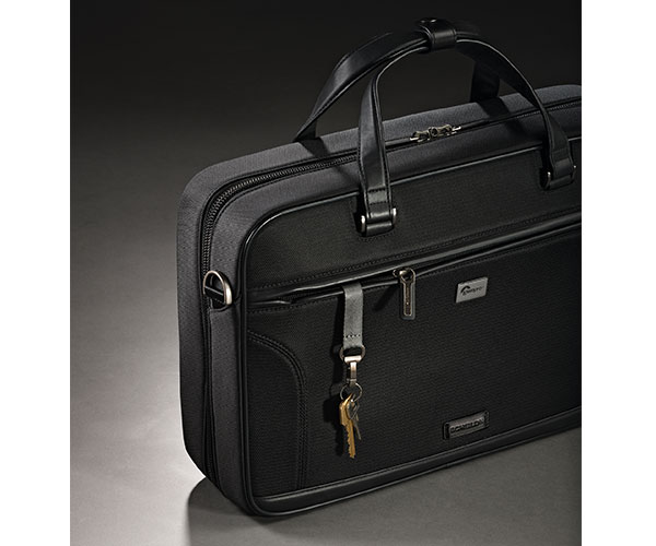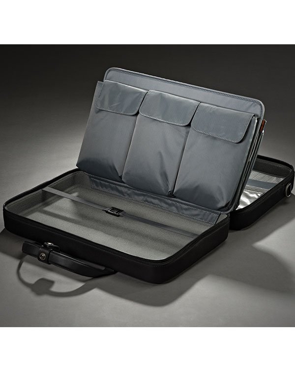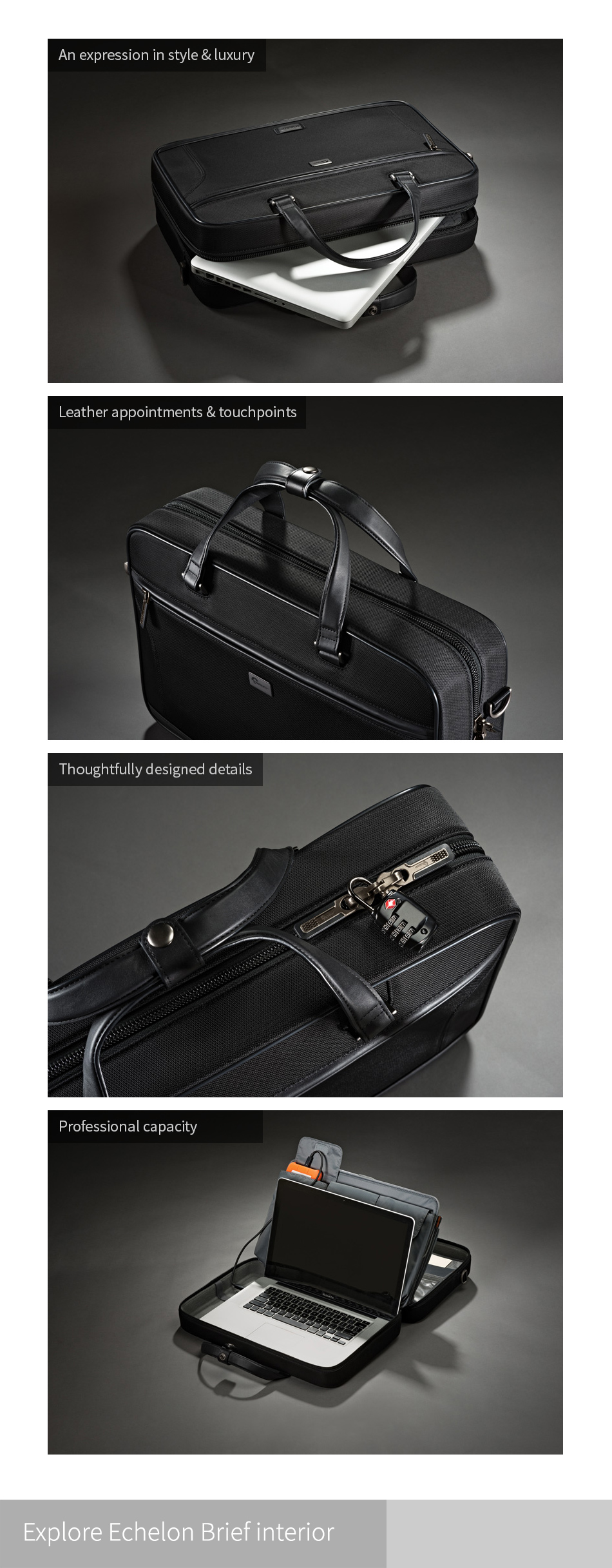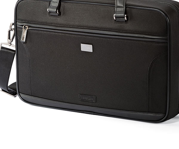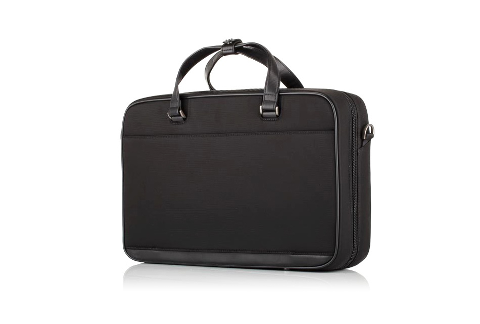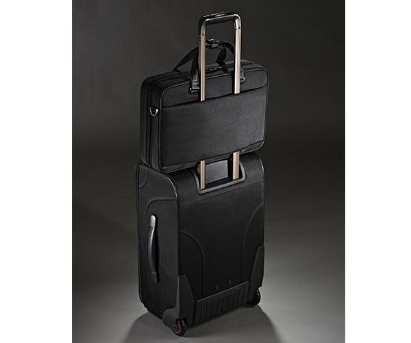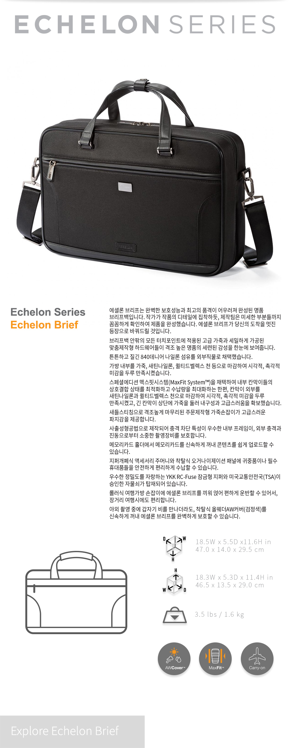 에셜론 브리프의 뒷부분에는 여행용 롤러백 손잡이에 고정시킬 수 있는 슬리브 구조가 적용되어 여행 시 편안하게 휴대할 수 있으며, 평상시에는 포켓으로 사용할 수 있습니다.