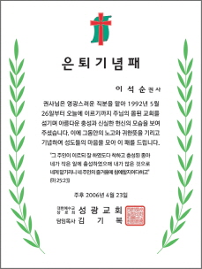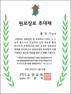 | < 4 - 장로 임직패 > | < 5 - 장로 장립패 > | < 6 - 은퇴기념패 > |