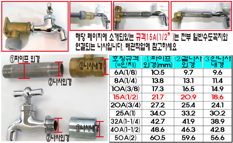 나사규격은 6A,8A,10A,15A,20A~가 있고 기본적으로 가정용 수도배관규격은 15A를 사용합니다. 꾸준한 업데이트 중이오니, 더욱 편리한 구매를 할수 있도록 준비 하겠습니다. 감사합니다.