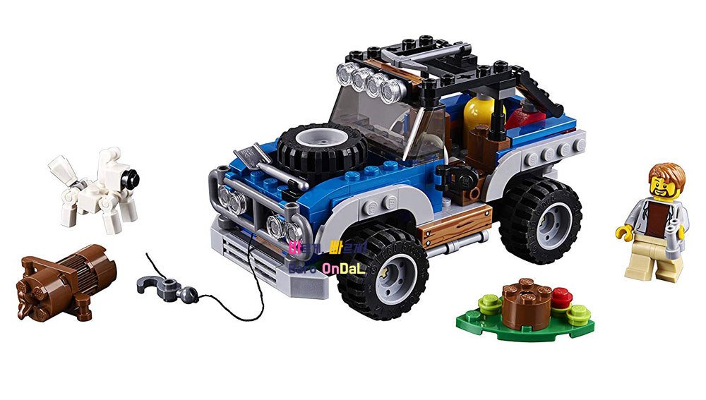 일상의 세계를 떠나 신나는 오지 모험을 시작하세요! 루프 랙, 롤 케이지, 두 툼한 타이어가 돋보이는 튼튼한 오프로드 자동차에 각종 공구와 장비를 싣고 길을 떠나는 거예요. 귀여운 강아지도 함께 운전석에 타고 가야죠. 거친 지 형을 타넘고 윈치를 작동하여 쓰러진 나무 둥치를 치우세요. 목적지에 무사히 도착했나요? 이제 오프로드 자동차를 분해하고, 쉼터와 보트와 시냇물이 있 는 야생의 캠프장 또는 대담한 구조 임무를 수행하는 윈치 헬리콥터로 바꿔 조립하세요.