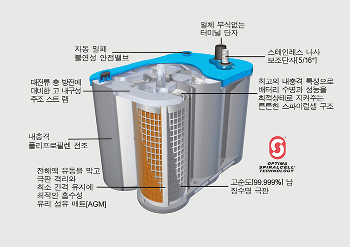옵티마 배터리의 비밀은 스파이럴 셀(Spiral cell) 기술에 있습니다. 보통 납 축전지의 셀은 여러 장의 카드 모양 전극 판과 전해액으로 되어 있지만 옵티마 배터리의 셀은 유리 섬유 매트를 사이에 대고 겹쳐 말은 단 두 장의 전극 판으로 되어 있습니다. 전해액은 이 유리 섬유가 흡수 고정합니다. 이렇게 셀을 만들면 부피를 가장 작게 할 수 있고 단위 체적당 에너지 밀도는 가장 큰 전지가 됩니다. 컴팩트 하지만 튼튼하고 파워가 크고 긴 수명에 가장 안전한 옵티마 배터리는 최초의 스파이럴 셀 납 축전지입니다.