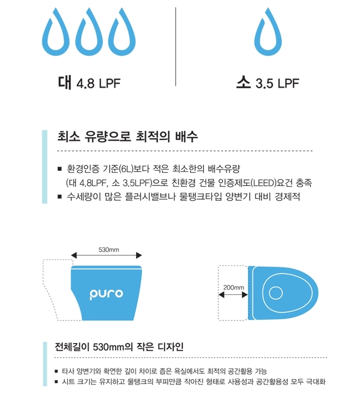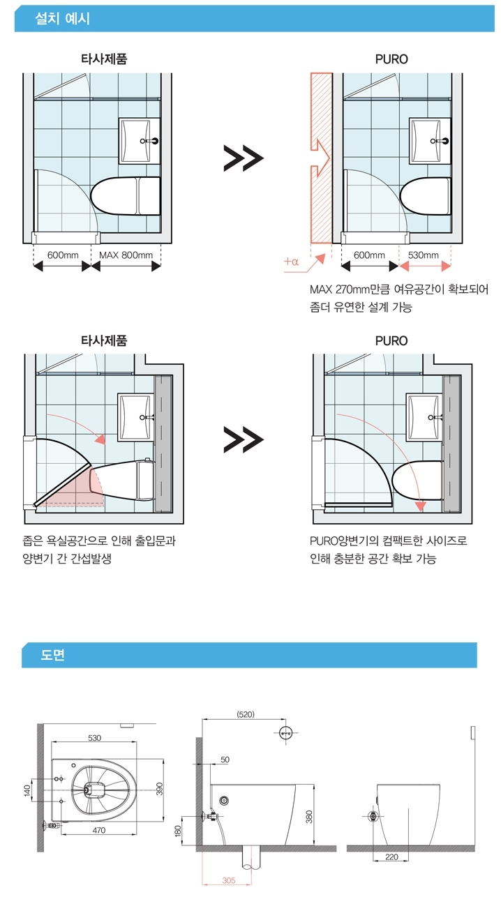 기존 양변기 (76센티미터) 보다 20센티미터 정도 앞뒤 공간 확보가 가능합니다.