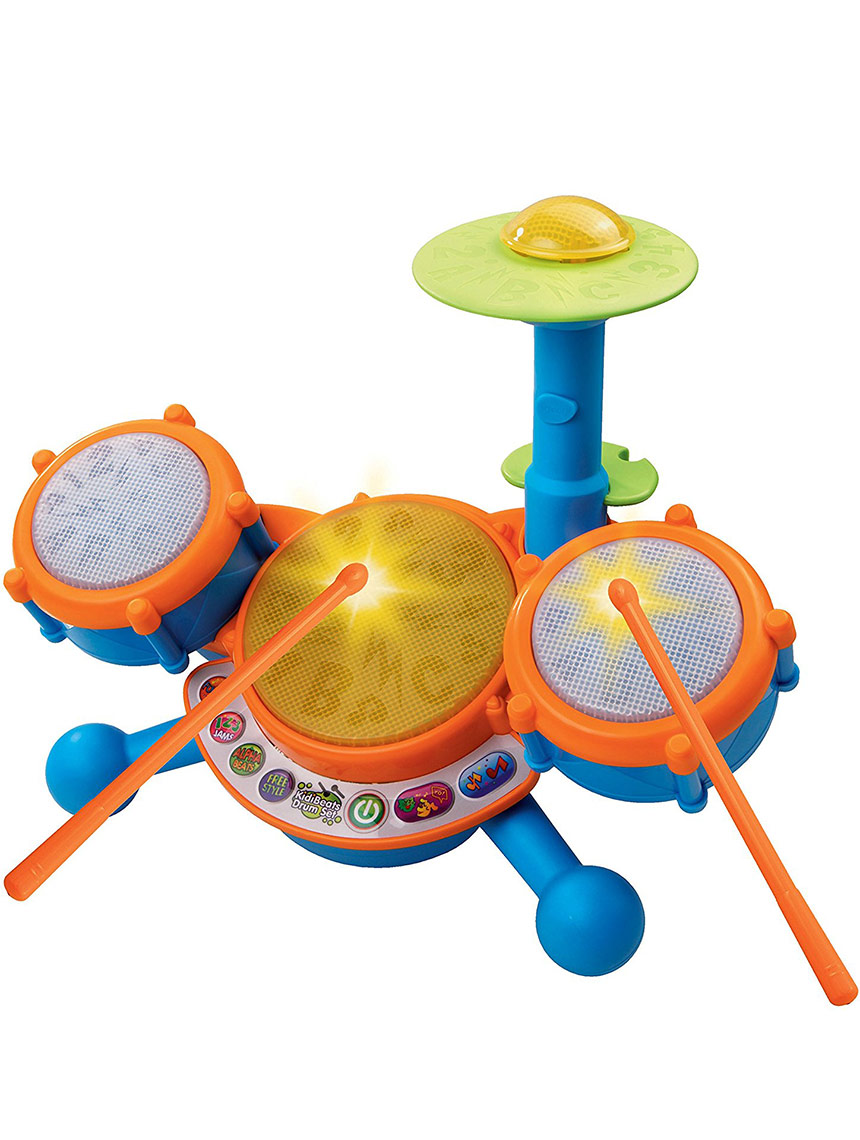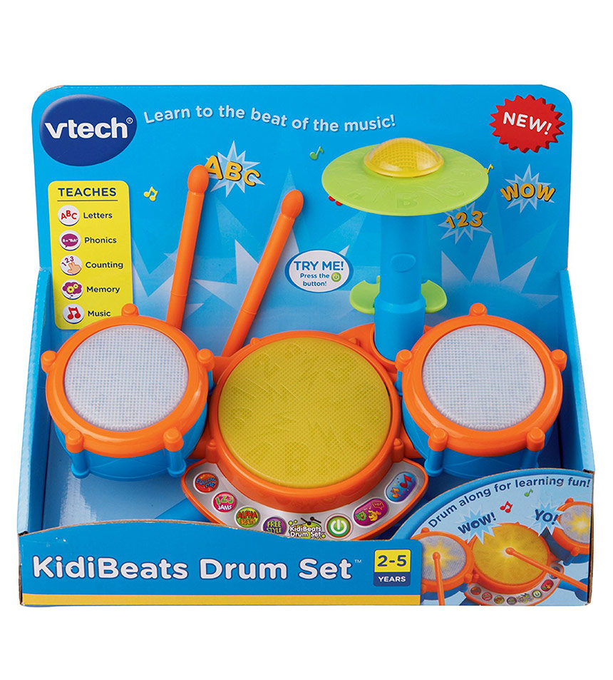 Perform like a star with the KidiBeats Drum Set. Tap the three light-up drum pads and cymbal with the included drumsticks to hear each of their unique sounds for sensory development. Play along to built-in melodies in a variety of styles including rock, dance, pop or in your own style to encourage musical creativity. Four play modes include Free Play, Letters, Numbers and Follow Along.
