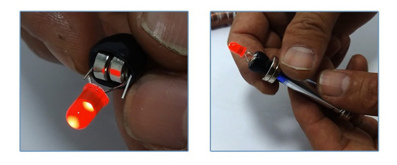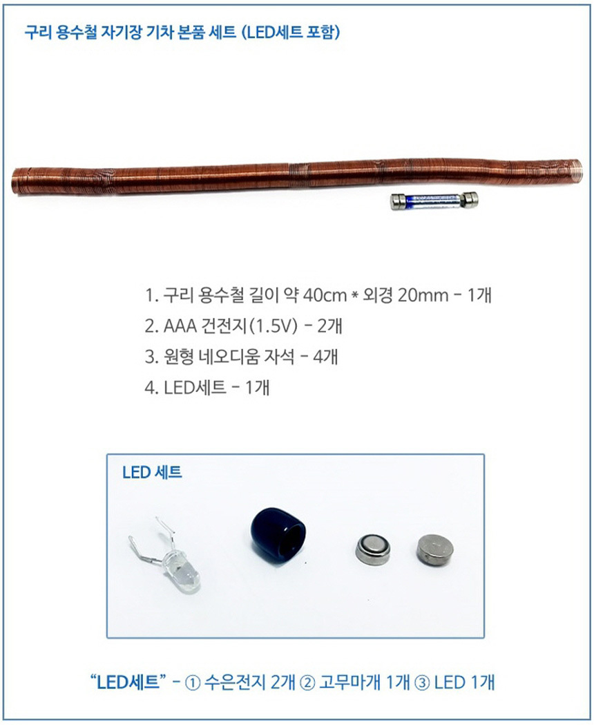 ★ 건전지에 자석을 붙일때는 평면부분인 쪽을 건전지에 닿게 붙여야 합니다. (건전지 +극 ㅡ극 모두 자석의 ㅡ극과 붙여주어야 작동합니다.)