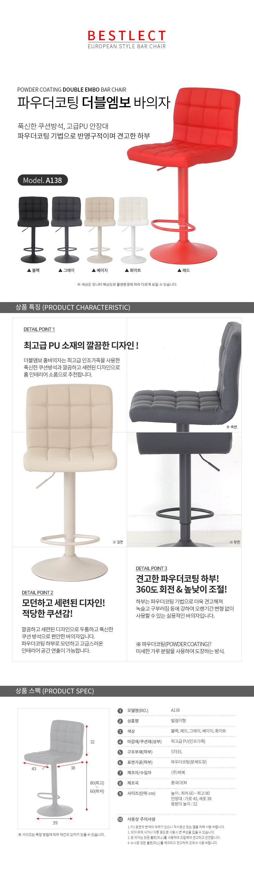 A138 더블엠보 파우더코팅 발걸이형 홈바의자